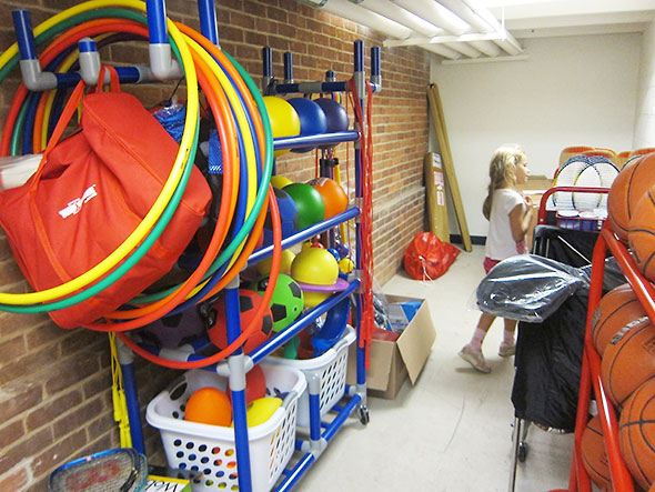 12:45pm A puppet show by Jim and Judy Rose is due to start at 1pm in the south gym, and we are on our way there when we meet up with friends and decide to quick tour of the facility before the show begins. We walk up a flight of stairs and enter Studio B. Two men have picked up rackets and a birdie and are having a fine game of badminton. We walk another flight up to the third floor mezzanine to view their game from the balcony above. The mezzanine—which strikes me as a perfect place to set up a few rowing machines—also allows window views of the first floor basketball court and fitness room.