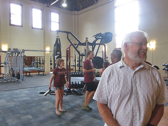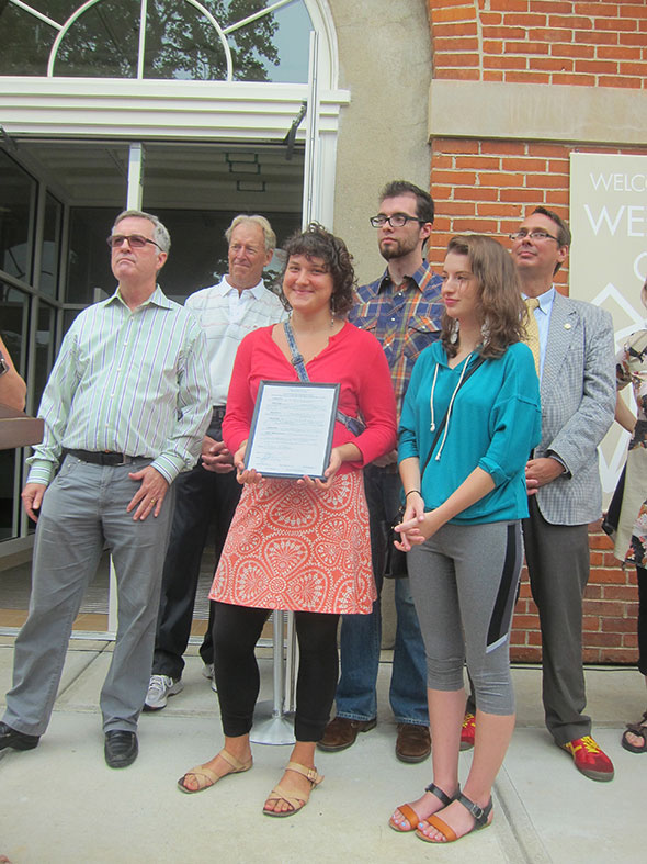 12:20pm Village Mayor David Foubert and Council President Karen Wintrow have both come with offerings to mark the occasion. Mayor Foubert leads by example and pulls out a personal check to contribute to the restoration costs of the center. He hands the check to President Roosevelt who wonders aloud how easily it might convert to a $100,000 donation. His check alone “won’t pass the bounce test”, Foubert warns but speculates that several others have brought checkbooks. The Honorable Karen Wintrow reads a proclamation declaring September 6, 2014 as Antioch College Wellness Center Day. Wintrow hands the proclamation to Roosevelt who passes it along to the student representatives. Roosevelt credits the students for pushing for today’s accomplishment hard: a fitness center on campus.