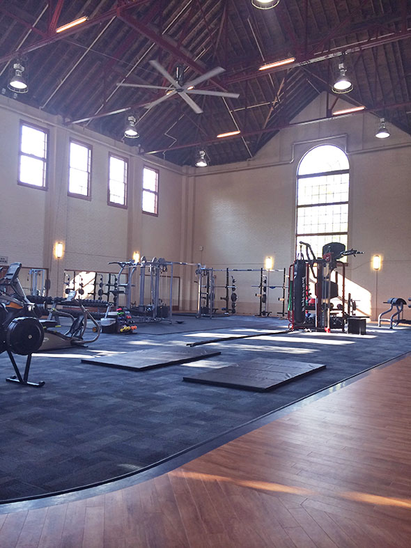 12:36pm I join the flow of people into the building. The building’s facade is brick with a gallery of windows on the second floor and an arcade of glass doors on the first. The entrance opens up into a lounge with two circular couches, several comfortable chairs, and a few bar tables and stools. Intent on sharing my explorations, I discover the guest wifi and the electrical outlets available on the crimson painted light fixtures next to the couches. To my left is the basketball court set up with a volleyball net and to my right is the fitness room stocked with free weights and intriguing assortment of gear. I try my hand undulating two long black training ropes before passing them off to a teenager as my family arrives.