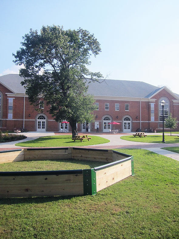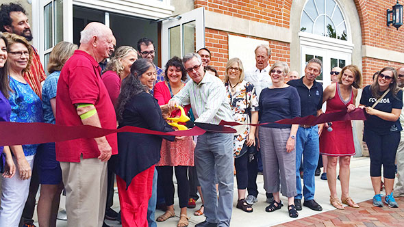 12:00pm The grand opening kicks off to a crowd of over 200 villagers. President Roosevelt takes the podium placed at the front entrance flanked by student representatives, project donors and builders, and village officials. He adds the wellness center to a list—Glen Helen Nature Preserve, the Antioch Theatre, and the Coretta Scott King Center for Cultural and Intellectual Freedom—of college assets that it enjoys with the Yellow Springs community and with the village joins in their restoration to full glory.