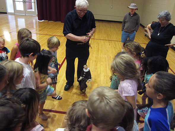 1:30pm Once Mr Punch bids them goodbye, Rose brings out the marionette Pepito and together the children and Pepito practice hopping on one foot and then the other. Behind us the chairs are being gathered up as the multipurpose room is prepared for its next offering.