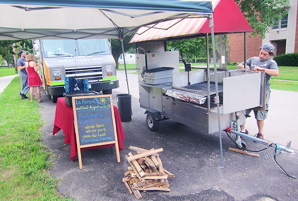 11am The food trucks have arrived and are setting up for the afternoon crowd. The center will have a snack bar next to the first floor fitness room, but this Saturday it is La Pampa Grill, Kinetic, and The Shakery Juice Bar.