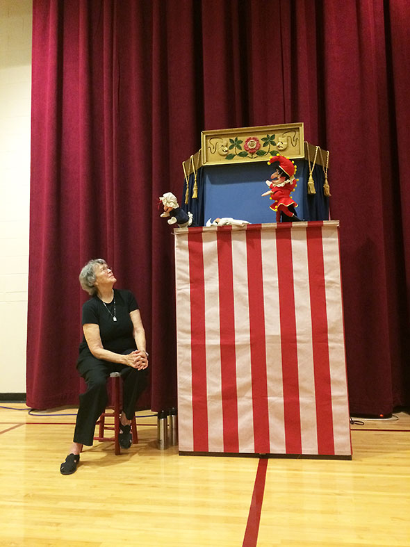1pm The south gym is bedecked in long red velvet curtains. A set of seventy or so chairs have been placed in front of a small puppet theater. The theatre has blue screen with a white and red candy-striped skirt. Jim Rose—puppeteer extraordinary and Antioch alumnus—knows his audience well and is chatting with the little children who have filled in the first two rows of seats. As the seats fill up, he encourages the children forward to get closer to the action of the puppet play. My son gives up his front row seat, comes back five rows to collect me and together we sit center stage as Rose gives his final instruction. Mr Punch is his dear friend but is likely to have any number of dangerous objects flying at him. He tells them please be sure to warn Mr Punch if you see any dangers that Punch doesn’t see coming.