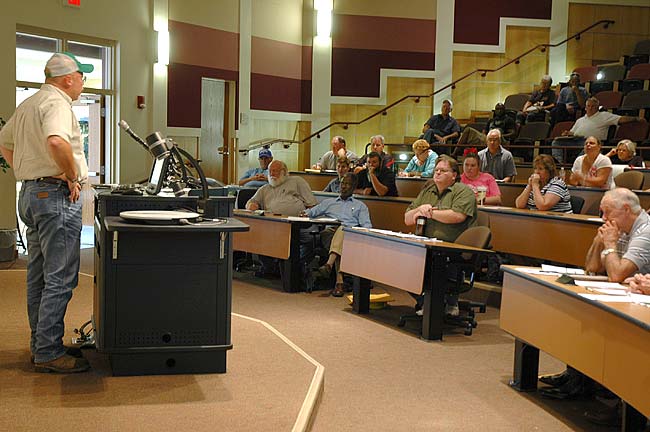 About 35 Xenia Township residents voiced frustration over plans by Cemex to expand its limestone mining into the township at a Xenia Township zoning commission hearing two weeks ago at Central State University. While Xenia Township is reconsidering rezoning Cemex’s land to mineral extraction, Cemex is planning to have the land annexed into Fairborn. (Photo by Megan Bachman)