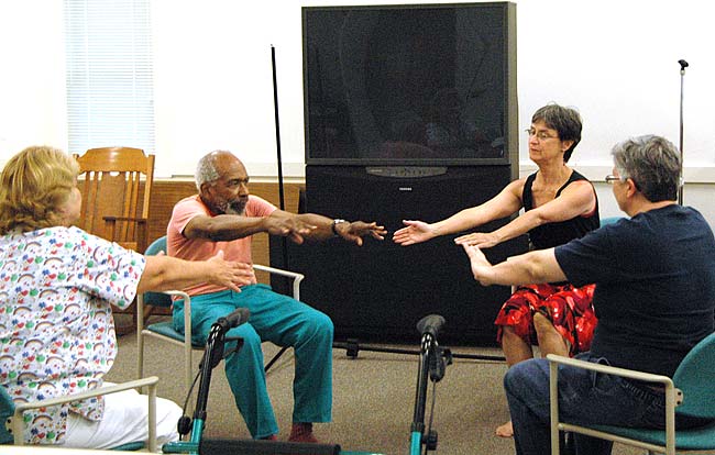 Each Wednesday at the Senior Center, dance instructor Jill Becker, third from left, works with Paul Graham, second from left, and Kim Korkan, right, who both suffer from Parkinson’s disease, a degenerative disorder of the central nervous system that causes gradual loss of muscular control and can lead to depression and dementia in its advanced stages. A regular regimen of exercise has been shown to strengthen muscles, improve mobility and have a positive effect on mood. (Photo by Jenn Wheeler)