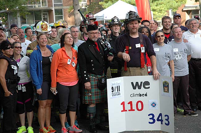 About 90 people from the community and area emergency response agencies came to Antioch College for the Miami Township Fire-Rescue department’s first 9/11 Memorial Stair Climb on Saturday morning, Sept. 27. Donning the badges of the 343 fire fighters who died during the Trade Center terrorist attack in 2001, participants, some in full turn-out gear, climbed the equivalent of 110 flights of stairs through the college’s North Hall dormitory. As they finished each rang a fire engine bell and announced the names of those they carried with them. The event raised approximately $11,000 for the National Fallen Firefighters Foundation that supports the families of those who have died in the line of duty.
