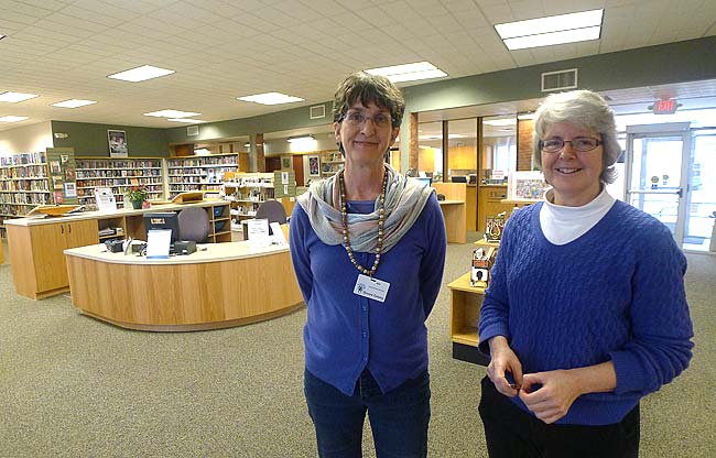 The library levy renewal that Issue 2 puts forth will be the first time in a decade that library leaders have asked for more money. Pictured above are librarians Ann Cooper, left, and Connie Collett, who helped design the new layout of the Yellow Springs Community Library renovation in January, 2013. (News Archive Photo by Megan Bachman)