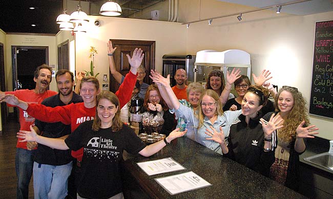 One year after reopening, Little Art Theatre staff members are thrilled that attendance and concession sales at the renovated theater are growing. Pictured are, from left, in front of the concessions: Andy Holyoke, Mark Breza, Evan Pitstick and Angela Moore; behind the concessions, back row: Margaret Veenstra, Josh Zinger, Anna Carlson, Rita Monaghan, Acala Cresci; front row: Paula Hurwitz, Cindy Hoffman, Gilah Pomeranz, Jenny Cowperthwaite, Margaret Morgan. Not pictured are longtime employees Lin Wood, Jeanna GunderKline, Karla Horvath, Kendra Cipollini, Carolyn Bailey and Jennifer Gilchrist. (Photo by Megan Bachman)