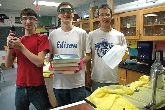 Yellow Springs High School announced recently that five of its students received National Merit recognition from their performance on the 2013 pre-SAT. Senior Francesca Brecha was recognized as a National Merit Semi-Finalist. Seniors Ben Ihrig, Dylan Boczar and Sam Crawford (pictured from left in chemistry safety gear) and Morgan Beard were recognized as National Merit Commended Students.