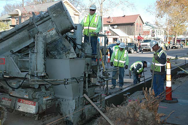 Crew members of Village contractor Durst Brothers Excavation were tearing up the town this week to construct new sidewalks and plant new trees along the east side of Xenia Avenue. The current phase of the streetscape renovation is scheduled to be finished before Thanksgiving. (photo by Lauren Heaton)