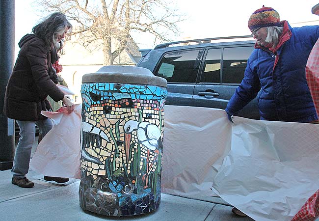 “It’s nice to see something that’s useful also be beautiful,” co-creator Beth Holyoke said last Friday morning, at an unveiling of the three new tiled cans she created with Käthi Seidl. And according to Council member Brian Housh, the cans serve dual purposes.