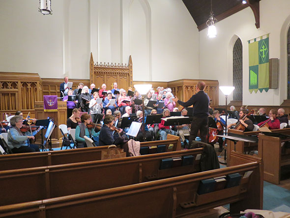 At the end of October, I joined the Yellow Springs Community Chorus to prepare for Sunday’s concert. Bassist Mark Munger turned me by the nose to join the ensemble shortly after recruiting me to join the Presbyterian choir for a service celebrating Lloyd Kennedy on his 100th birthday. The community chorus has been meeting Sundays at 7pm in the high school band room since September. By the time I arrived on the scene, they had the notes and German vocabulary of the Mendelssohn choral movements down pat and were working on dynamics. My friend Mark and director James Johnston assured me that I would catch up in no time though I’ve been glad for every moment that I have managed to match pace with my peers. Collectively, the pace of all our hearts picked up as the orchestra, chorus, and soloists converged to practice this past week. Saturday morning was particularly fine with the morning light streaming through the sanctuary’s stain glass windows and the full ensemble rested and ready to roar. The young people in the orchestra drew my notice with special interest playing trombone, cello, violin, and tympani with confidence, precision, and expression along side their older peers.