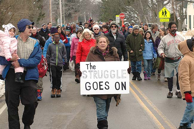 This year’s Martin Luther King Jr. Day, Jan. 19, will be commemorated locally with a downtown march, music and lecture program at Central Chapel AME Church and teach-in at Antioch College. Walking in last’s year MLK march were, from left, front row, Bill Firestone and Chrissy Cruz; second row, Shawn Kintner, Sylvia Carter-Denny, Harvey Paige and Brian Upchurch. (News archive Photo by Matt Minde)