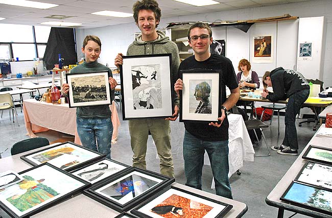 The Yellow Springs High School advanced art class will hold a student art show, Views of the Village, at the Village Artisan’s Gallery, 100 Corry St., during the month of January. An opening event will take place on Friday, Jan. 9, 6–8 p.m. Some of the artists include, from left, Nadia Mulhall, Tom Amrhein and Lake Miller. (Photo by Lauren Heaton)