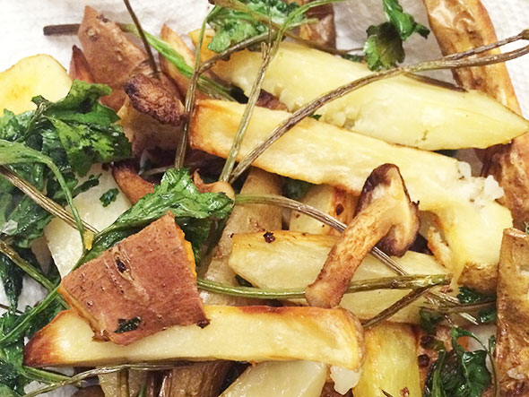 While I was away, it occurred to me that I could have some fun with the fries. I remembered a cluster of shiitake mushrooms that I had stored in the refrigerator. I also had a bunch of parsley awaiting an uncertain fate. I imagined dressing these vegetables and adding them to the potatoes near the end of the roasting time. I started to get excited about the meal myself. Oooo, I could even grind up my dried garlic cloves and add garlic powder to the dressing.