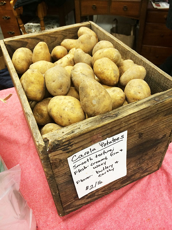 I did have potatoes—fist-sized carola potatoes that I bought Saturday from Flying Mouse Farms at the Winter Farmers Market. I even remembered overhearing Michele Burns recommend the variety to a customer who was planning a batch of homemade fries. Grabbing a computer, I flipped through a few recipes online. Though I baulked at actually frying my potatoes, I did take note of a common thread in the recipes. Most recommended soaking the cut potatoes in water for an hour or so. The water keeps the potatoes from browning once cut and also removes surface starch to improve the crispiness of the fries.