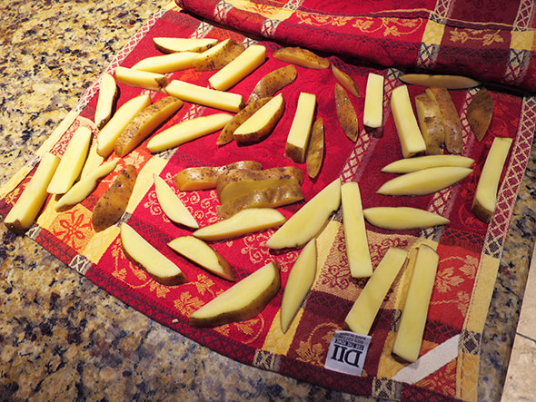 We set aside the bowl of soaking potato and soon after my husband Jeremy arrived home. I put in a request for burgers for dinner and headed to work. When Jeremy noticed the bowl of soaking potatoes, he sent me a text all in capital letters: FRENCH FRIES!!!! It would appear that my son shares a deep seated affinity with his father.