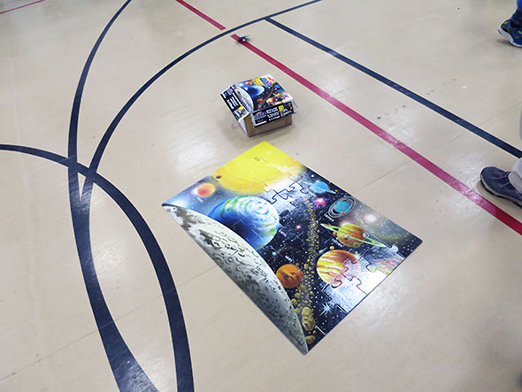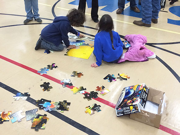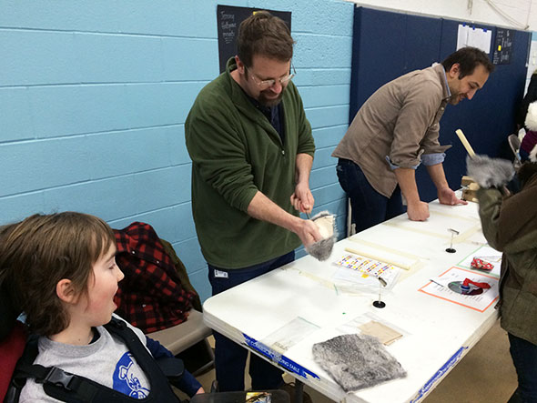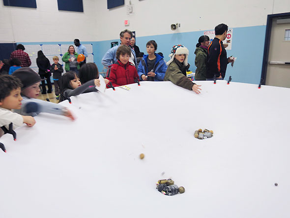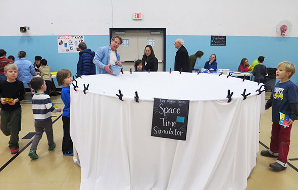 Jeremy relieved me at the Space Time Simulator for a spell so I could take a turn about the other demonstrations in the room. Students were hard but happy at work all about the gym and surrounding hallway. Down the hallway ramp that leads up to the school library, children were holding impromptu racing trials with hovercrafts made of balloons, pop-top lids, and compact disks. Young biologists munched on the various parts of plants—roots, seeds, stems, leaves, even fungi—and accepted bean kits to sprout at home. Surveyors took estimates of tall structures using right triangles and examined the dispersion of water through different soils. Kids watched fluffy marshmallows expand before their eyes under changing conditions of heat and pressure.