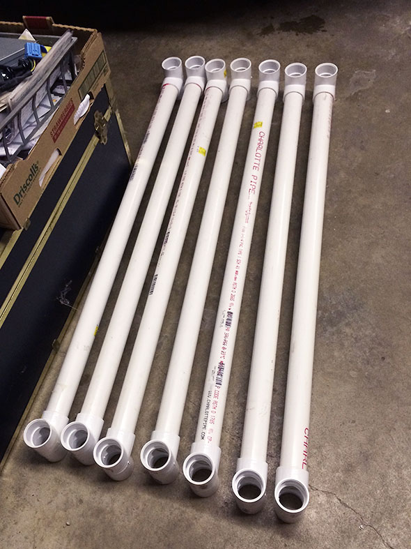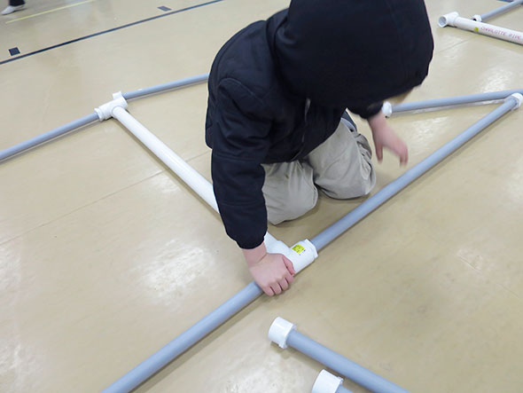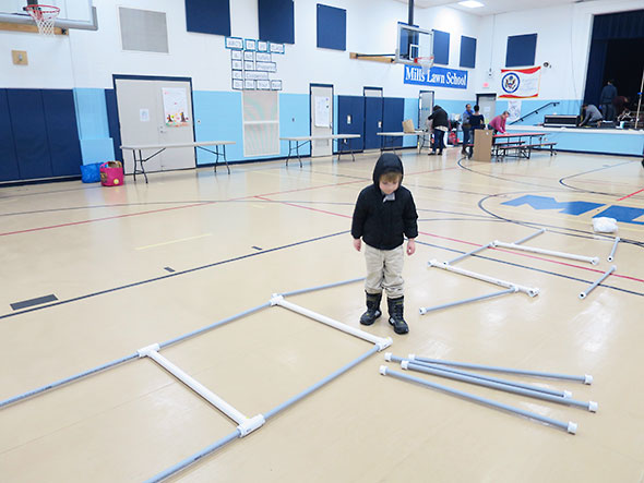 We arrived at Math and Science Night at 5:30pm Friday and unpacked the set of pipes first. I looked around for a couple of volunteers to construct the simulator’s PVC-pipe frame and, when I turned back, I found its assembly well underway. My four year old son had found his purpose and was diligently assembling the supports in the shape of a ladder.