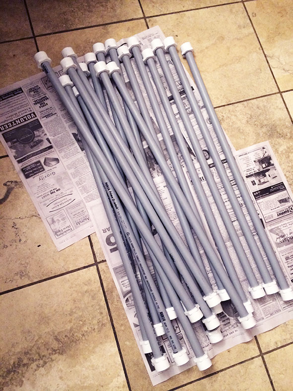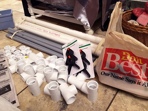 The folks at Downing’s were intrigued especially when I shared Mr Burns’ video describing the project. They cut the PVC pipes to spec and ordered connectors and clips. When my husband brought the components home, we laid out newspaper on the kitchen floor, donned masks to filter fumes, and began cementing connectors to pipe. Each pipe needed two connectors, and the orientation of the T-connectors mattered in particular. I found the best way to postion the connectors correctly was to balance the three part assembly—T-connector, pipe, T-connector—so that the connectors rested perpendicular to the floor and held the pipe a couple inches off the ground. Once in place, they formed a long, flat H. The cement locks the pieces within a second or two so my husband helped attach the T-connectors. He held the first T-connector flat to the floor while I gave the second T-connector its final orienting twist. The smaller connectors glue to the electrical conduit; their orientation does not matter so Jeremy was soon relieved of manufacturing duties. He put the children to bed while I completed a set of 7 vertical supports (white) and 14 horizontal (gray) plus spares.