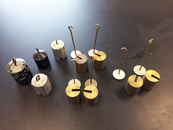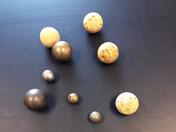 With the spandex and frame assembly gathered, I had the necessary components to model time and space but not the objects that would interact on the space-time fabric. For these objects, we borrowed several 500 gram weights and spheres made of glass, wood, metal, and cork.