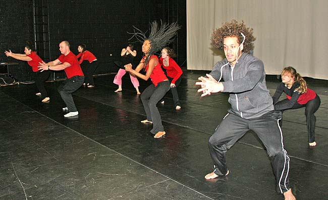 “Our American Skin,” an original dance by Valerie Blackwell-Truitt, center, will be one of the pieces by local choreographers performed at this weekend’s Yellow Springs Community Dance Concert, at 8 p.m., Friday and Saturday at the Antioch College Foundry Theater. Also performing above at right is Blackwell-Truitt’s son, Kyle, to whom the dance is dedicated. See article at bottom of page on the event. (photo by Suzanne Szempruch)
