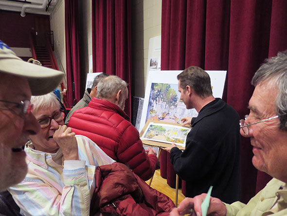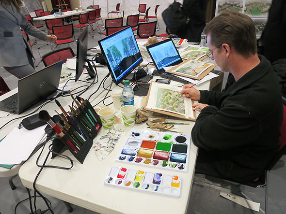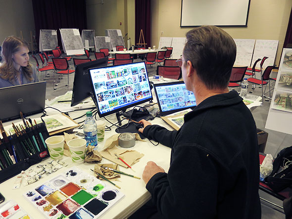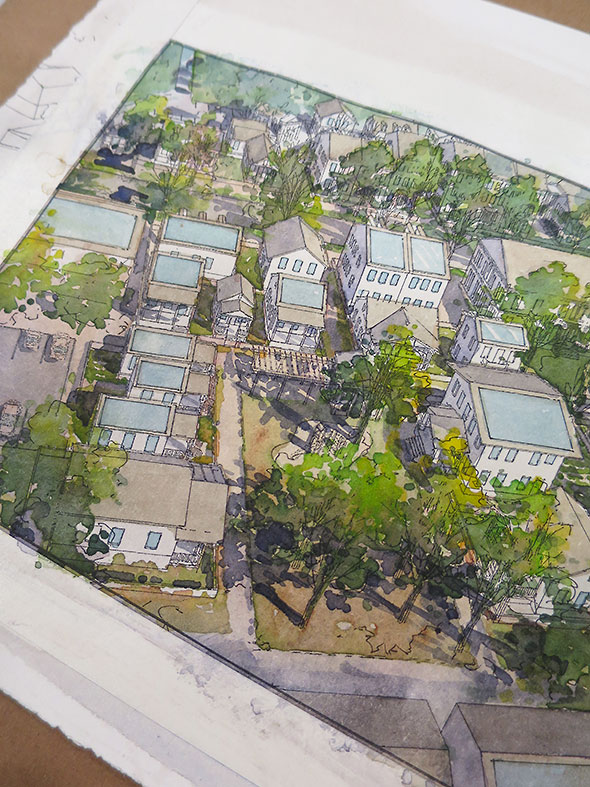 My own interests drew me to the craft before me equally fascinated by the tables of the architects and the illustrators. Poised over creations, the tools of their trade were not simply on display; they were in bold concentrated action. As I watched, Architect Marice Chael planted a grove of courtyard trees to a rendering of co-housing units. Watching her work, I took an extra bit of bliss in the familiar objects that surrounded her focus of attention…straight edge and curl, compass and stylus. Her fist-sized eraser was set immediately at hand—not hidden—as if she were unafraid to take risks or to reexamine consequences. Veteran illustrator James Dougherty had at least two watercolor prints in front of him at any time adding to the master works in parallel. When I entered the room, he was painting the deepening shadow of trees to street level and birds eye views. On his computer, he flipped through pages and pages of Yellow Springs photography—drinking in the eclectic pallet of color—and selected purples, oranges, and greens to paint variation into intimate clusters of cottages and neighborhood gardens.