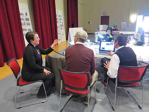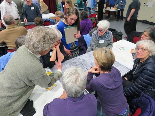 Sunday night kicked off with a open design session. The south gym of the Wellness Center was arranged in tables. We were there to work more than listen, but, as Sandy Wiggin set the scene with a talk on living communities, I wondered how the audience could hope to contribute in a meaningful way. The team introduced to us had sterling credentials. Reassuringly, they seemed to understand us well as a community and also seemed to appreciate the experts of place represented in the room. They called out the biases—the disproportionate representation of residence who had lived in the village for over 20 years and of residents who were over 65 years old—and also explored the range of priorities both in the larger room and at each design table. Next, we were given an opportunity to make our case and explore the challenges and potential seeded in the campus. If we met with skepticism, we were told, “Argue with your pencil.”