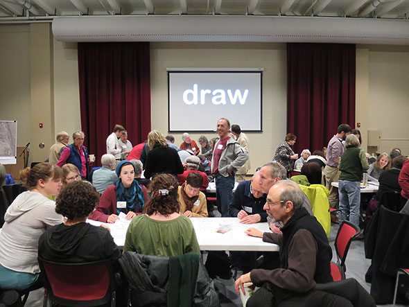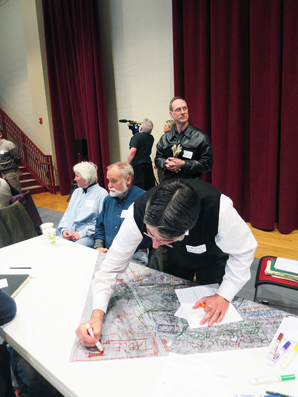 That story won an surprisingly positive response from Thursday’s crowd. Standing in front of the favorable results to the poll question “Are we on the right track?”, President Roosevelt admitted to his own skepticism in the lead up to the charette. He thanked the gathered public for their own skepticism and engagement and placed credit for the charette’s success at the feet of the design team.