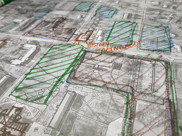 Besides the charette is beginning, not end. The charette’s design team has set up an online forum to extend its open studio through the end of March. In the interim report presented to the public on Thursday, Victor Dover reminded us that the lines inspired, inked, and colored at the charette still have a lot of give and bounce to them. They do not represent permanence but ideas that will morph and warble. Dover made a simple promise to the gathered stakeholders, a promise that stands as a dare to the campus’s current residents and the village as a whole.