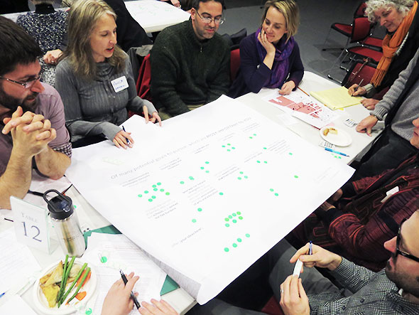 This quick process demonstrated that we had a fairly balanced set of interests represented at the table. The leading interests at the table were green building and community interaction closely followed by connecting with nature and supporting the college financially. I voiced my surprise over the single vote cast (mine!) for leveraging the village’s natural strengths. However, I was quickly reassured by Andrew Kline that “We are talking Yellow Springs. That’s given.” His assertion earned a chorus of vigorous nods.