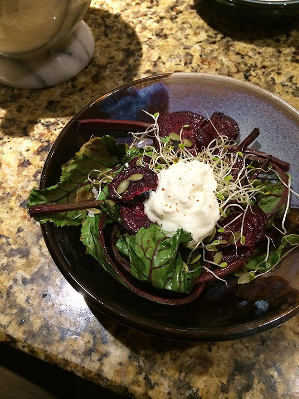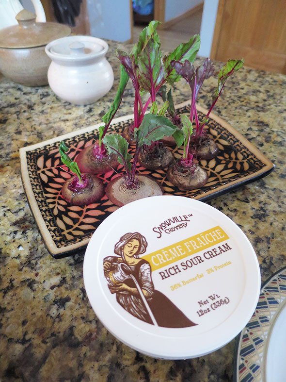 Rescuing the roasted veggies from the oven heat, I piled the beets into a bowl and layered on pumpkin seeds, clover sprouts, and a generous dollop of creme fraiche, a rich sour cream that Snowville Creamery now distributes to Tom’s Market. I sprinkled the last of the powdered garlic on top and split the bowl with my husband.