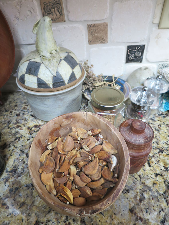 Between the sprouts and my own countertop garden of beet greens, I’ve had a respectably steady source of fresh crisp greens through the winter. Our house store of garlic on the other hand has all gone dry. Today, Jeremy went through the ivory white garlic husks littering our counter in a vain search for a fresh clove. Due entirely to his efforts, we now have a bowl of dried out garlic—some fifty or so ready for grinding—and a whole lot more counter space for having composted their natural packaging.