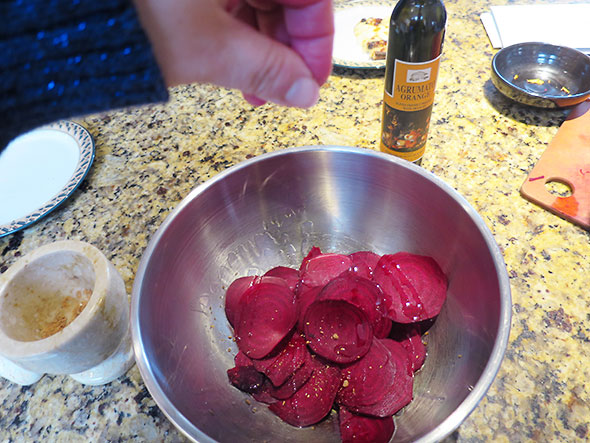 I stripped the beet greens and sliced the beet heads thin so they would take the heat quickly. I tossed the beets rounds in agrumato—citrus infused olive oil—and then added the pulverized powder from a ground garlic clove. I broiled the seasoned beet rounds first, then their leaves with the stems still on.
