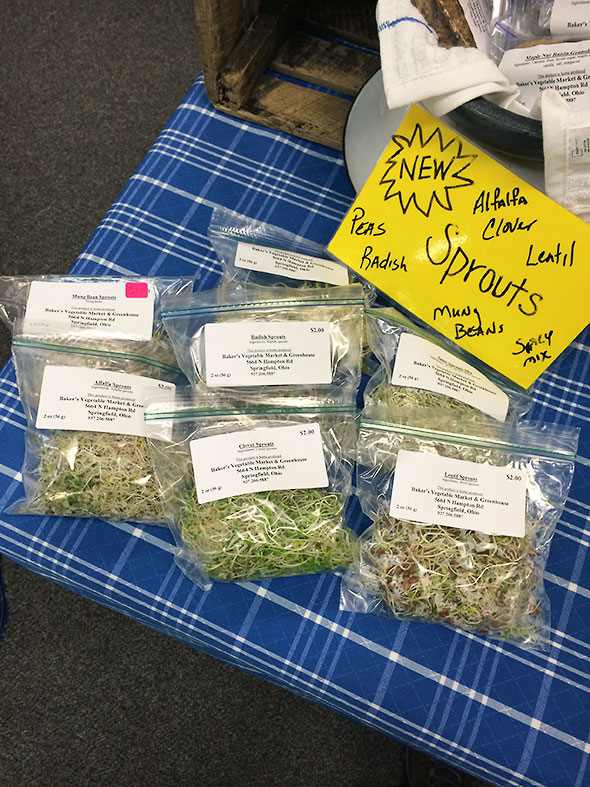 In the meantime, thank goodness for Baker’s Vegetable Market and Greenhouse. Since their second week at the Yellow Springs Winter Farmers Market, they’ve been bringing sprouts. Ever since, I’ve been dressing my savory plates—breakfast, lunch, and dinner—with their lentil, clover, and radish microgreens.