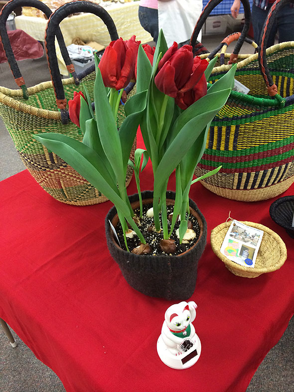 Me? I’m not feeling so patient. Luckily, next week’s farmers market will offer sweet respite. Local farm Zen Blossoms promises to bring a trove of spring bulbs—tulips, hyacinths, and crocus—in a array of bright colors. Their perfume will fill the great room at the Senior Center and cannot—will not—be missed. If I’m a lucky cat, I’ll bring home a pot of blood red tulips just like the sample Mandy Sue had on display this Saturday.