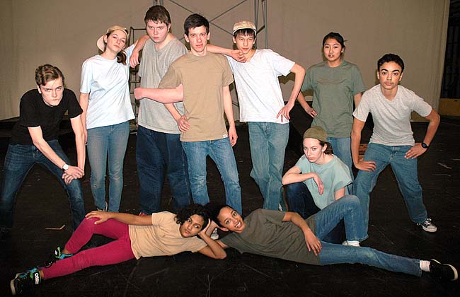 The Jets of “West Side Story” starring from left, Duard Headley, Meredith Rowe, Bear Wright, Josh Seitz as Riff, Jonah Trillana, Ursula Kremer, Christina Brewer, David Walker, and in front, Sumayah Chappelle and Zoe Williams. The show opens this weekend at the Antioch College Foundry Theater. (Photo by Lauren Heaton)