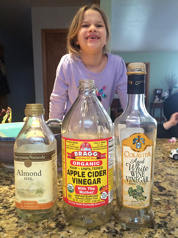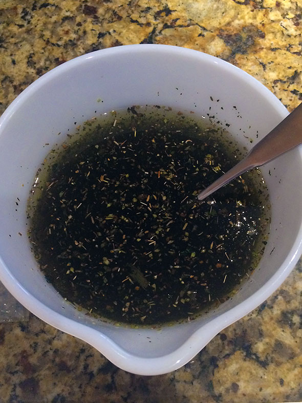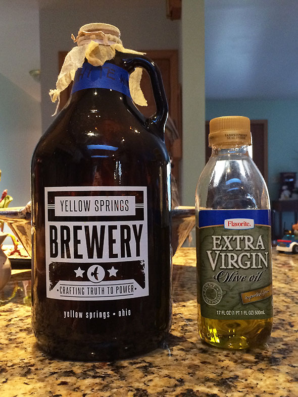 When they are in ample stock, other oils work as well, walnut and olive in particular. Instead of white wine vinegar, Jeremy could’ve used the homemade wine vinegars that I’ve been mothering in two Yellow Springs Brewery growlers, one white wine and one red, tucked under the kitchen sink. Had he known Grandma Katherine’s secret, he could have replaced the vinegar with the red wine Grandma preferred in her spiedie sauce. Still, his discoveries in the pantry were excellent choices, and the almond oil and vinegars combined with Weezy’s spices made a fine aromatic marinade.