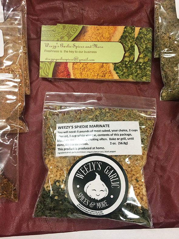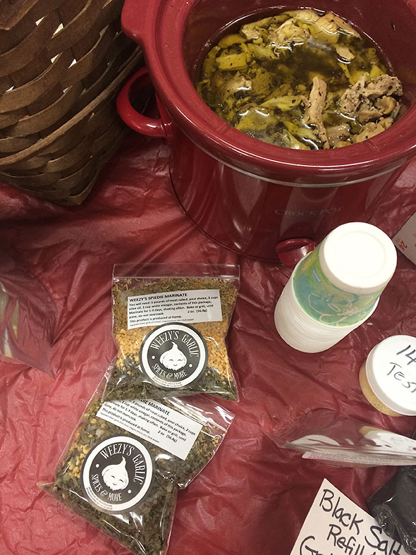 Then one Saturday while at the winter farmers market, I realized that a more immediate solution was right in front of me. Louise Berrier of Weezy’s Garlic, Spices & More was setting up her table of resplendent dried foods, and I asked her if she could blend together the dry ingredients for my favorite sauce. I spelled out the name of the potion S-P-I-E-D-I-E and she promised to look into it. The very next week she not only brought the spice blend but a crockpot of spiedie chicken that she’d marinated since Thursday. The aroma filled the room—enough to start my mouth watering—and I took home two packages of the seasoning that day. I might have taken more but the seasoning proved a hit that day. Louise sold completely out.