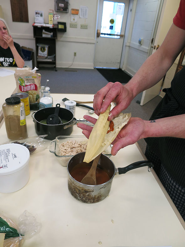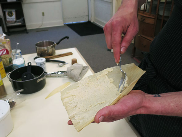 Next, Corey dried off a corn husk which had soaked in water for two hours and spread a heaping tablespoon of masa on half of the husk. The husks are shaped like a V and he pointed the tip of the V away from him spreading the masa across its wider top. Then, on top of the layer of masa, he added a dollop of red sauce explaining the different kinds of tomato-based hot-pepper-kicked red and green sauces that different families prepare for their own tamales. On top of the sauce he added a spoonful of chicken pulled from its bone and added a touch more sauce. Then he rolled the tamale together folding the empty tip over and leaving the masa filled top open. When ready to steam, the tamales will sit folded tip down to cook.