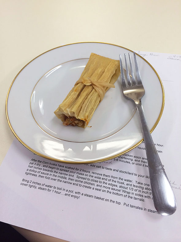 My classmates and I took our turn rolling the tamales. I had a hard time keeping the tamale ingredients from spilling out the seams of the tamale but, after a couple wayward attempts, soon found an adjustment to how I spread the masa that kept the mash contained in its wrapper.