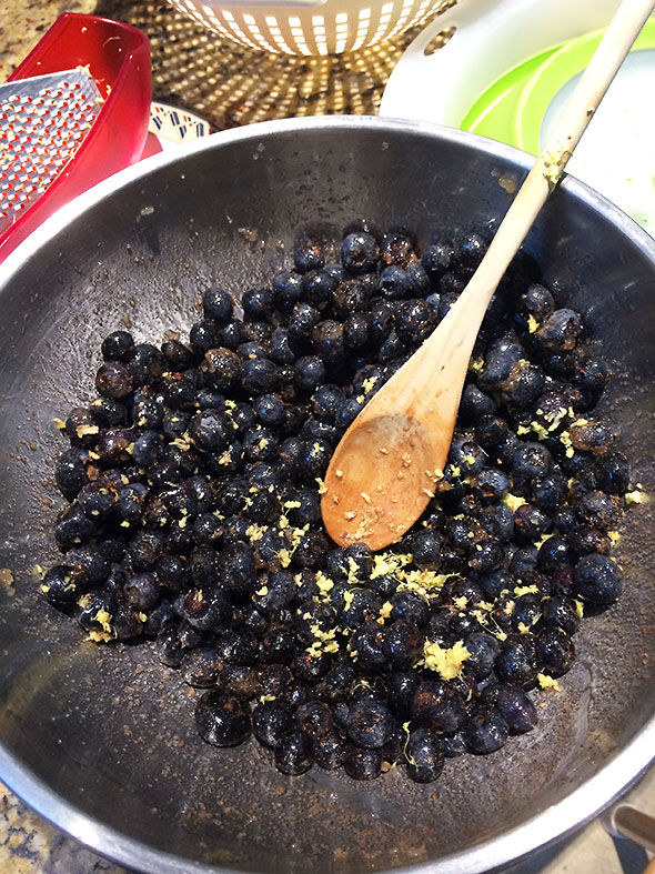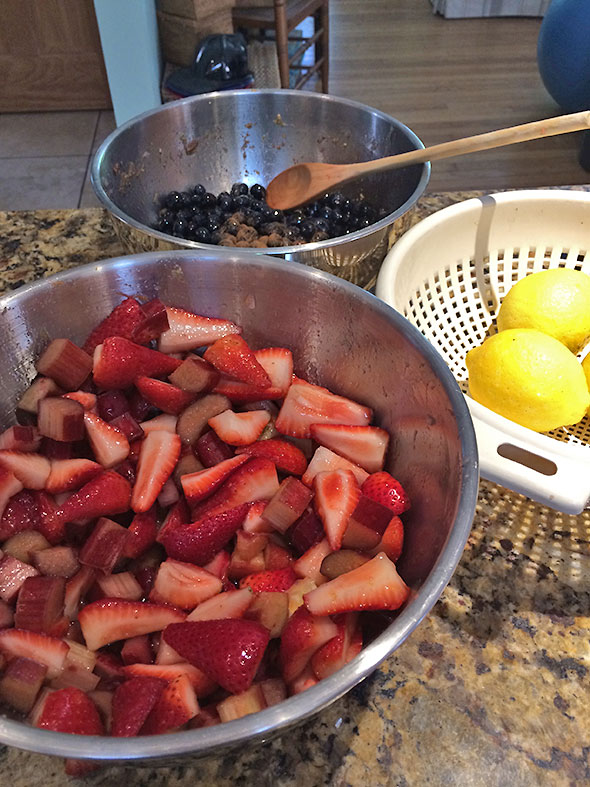 My resolve was not born of pure spontaneity but to a specific purpose. About mid April, the thought occurred to our neighbor Phyllis Logan that, over the past two years, the block has had a significant amount of turnover in residents. We were overdue for a block party. As the resident whose tenure is second to longest on the block, she took up the charge of organizing a meet and greet and invited the neighborhood—some 12 families—to a Sunday afternoon tea. When the tea was threatened by rain, she deftly pivoted herself and reorganized a evening party of beverages and desserts for Tuesday. I promised to bring ice tea and pie. With the exquisite model from Sunrise Cafe forward in my mind, I decided to bring two pies: one strawberry rhubarb, one blueberry.