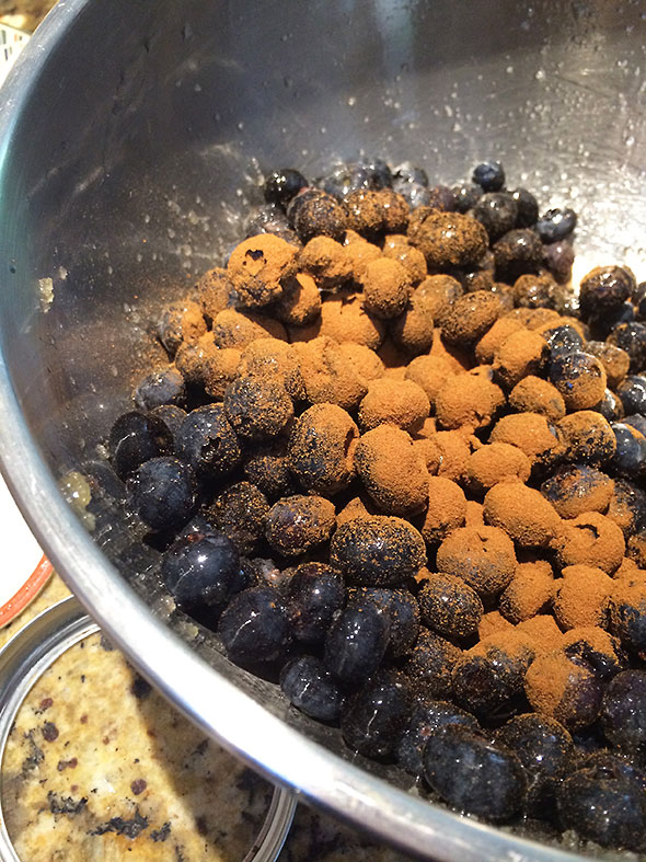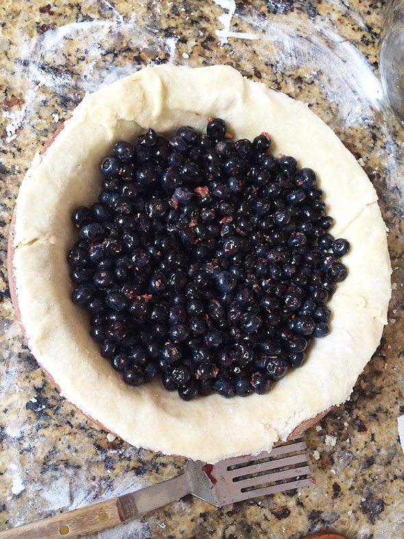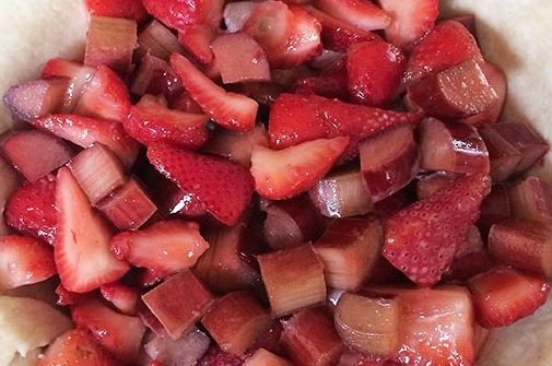 When we roll the dough flat to the necessary width, I drape it over my longer rolling pin and transfer it to one of the pie plates. Before adding the filling, I taste the juices that have separated from the berries and make adjustments…a touch more honey to the strawberry rhubarb, more cinnamon and salt to the blueberry. When satisfied, my son and I add a quarter cup of tapioca flour as thickening agent to each mixture and load the first pie with strawberry and rhubarb.