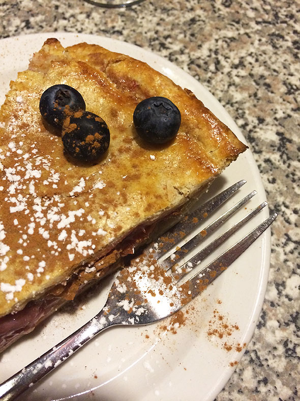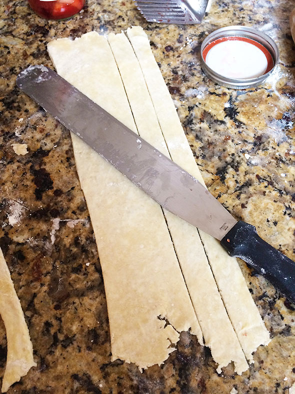 After we roll out the second crust bottom and fill the second pan, my son asks if he can eat pieces of salvage dough that we trim from outer rim. I hold him off not knowing how much dough we need to top the pies. After adding the blueberries to their pie plate, we roll out the last dough round and the accumulated pile of dough salvage then review the mechanics of forming a pie crust lattice. My son helps cut long strips of dough and place them strategically. Together, we flip pie dough scraps back and forth across the filling and weave in new strips. Once we form an interlocking mesh over each pie, I hand over the remaining four scraps of dough. He grabs a plate and a tall cup of milk and enjoys his spoils in great luxury at the dining room table.