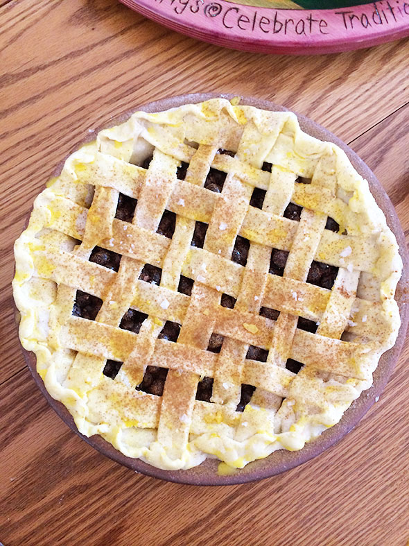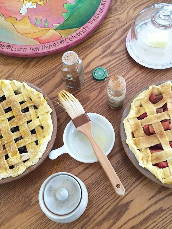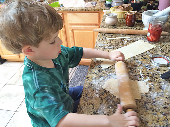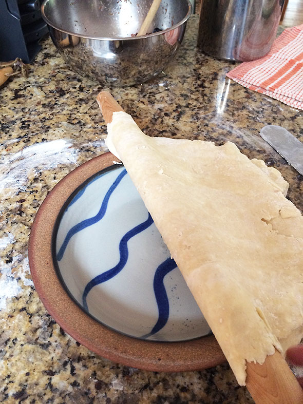 I put away the honey jar, sheet pan, and food processor and pull out a rolling pin along with two of my favorite dishes…stoneware pie plates from Miami Valley Pottery. I have just set the kitchen when my four year old joins me. He misses hardly a beat to take in the situation before he sets a stool next to my hip and goes to the pantry to collect his own favored rolling pin from the cupboard.