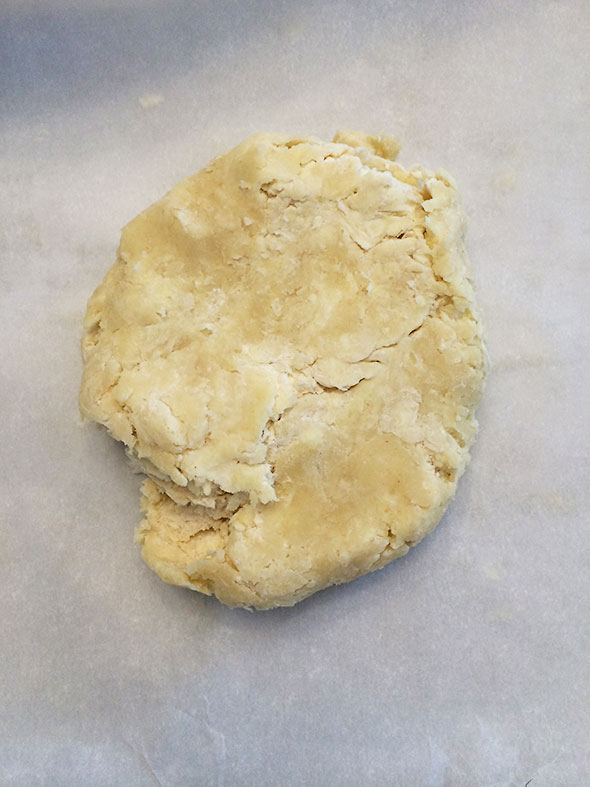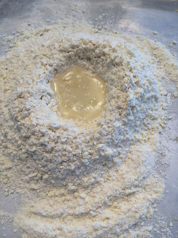 Next, I pour the crumbly flour onto a sheet pan and form a deep central well in its cool mound. I add four tablespoons of ice water—two at a time—and work the dough modestly by gently introducing the water throughout and then pressing the mixture together to see what holds its shape. I separate any dough that successfully holds together—even just barely—and dribble small doses of ice water on the flour mixture that falls away until it too takes shape. With slightly damp hands, I form a single round by pushing together sections of dough. I stop when I can flatten the dough ball to a thickness of two inches without the ball falling apart into pieces.