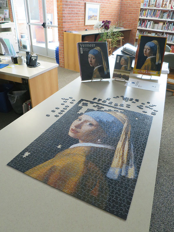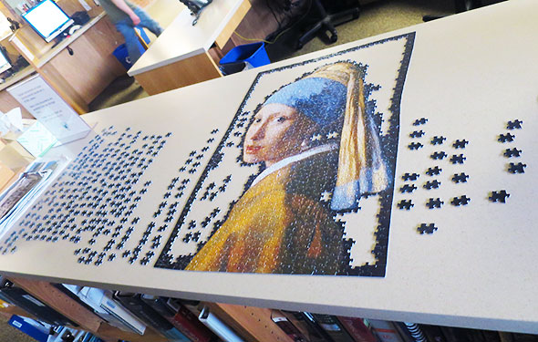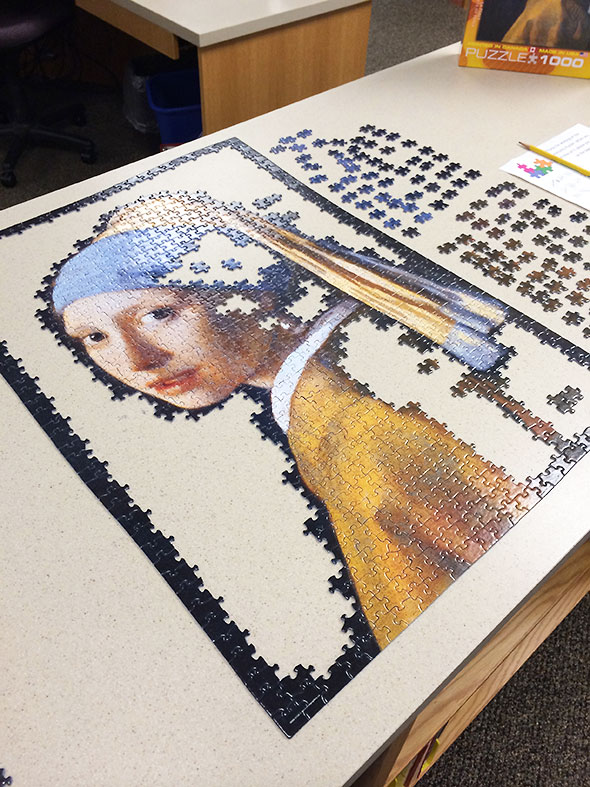 With a bit of reluctance, I excused myself. On my own for a solid 45 minutes, I took the opportunity to walk over to the library and make a sliver of progress on the current community puzzle: Johannes Vermeer’s Girl with a Pearl Earring. This puzzle has proven crazy hard, the most challenging in recent years. Its pieces are almost entirely the same basic shape—animal-like with a head, a tail, and four legs—and found their place slowly through painstaking sorting by color and subtle variations in texture and shape.