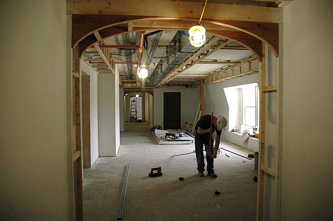 At present, much of the interior detail has yet to be started as the roof, siding, plumbing, electrical and fire suppression systems are completed. Arriving soon is the Amish-made furniture from Holmes County, including four-poster beds and mattresses for the guest rooms. Hammond is about to start constructing an elaborate front desk.
