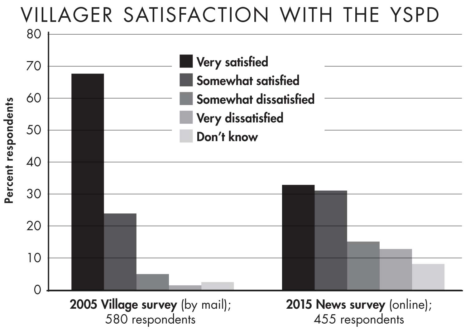 However, villagers may be far less satisfied now than was reported in a 2005 mail and random telephone survey completed by the Village of Yellow Springs. According to that survey, designed to gauge citizen satisfaction with many government services in light of budget constraints, 92 percent of respondents said they were satisfied with the police department, two-thirds of whom said they were very satisfied. Only six percent said they were dissatisfied by the YSPD in that survey. While in the News survey 13 percent of respondents were very dissatisfied, just 1.2 percent were very dissatisfied in the 2005 Village survey.