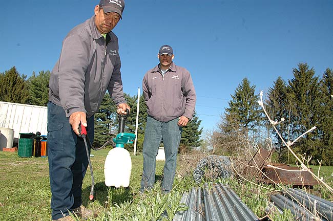 Jason Hamby, right, superintendent of streets, sewers and parks, looked on as his crew member Kent Harding recently tested a new, all-natural, vinegar-based spray to kill weeds without the use of synthetic chemicals at the public works headquarters at Sutton Farm. The Village is exploring alternative methods and products to conventional herbicides on public property this summer while a new pesticide policy is developed. (Photo by Megan Bachman)